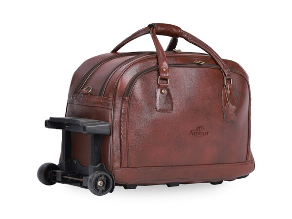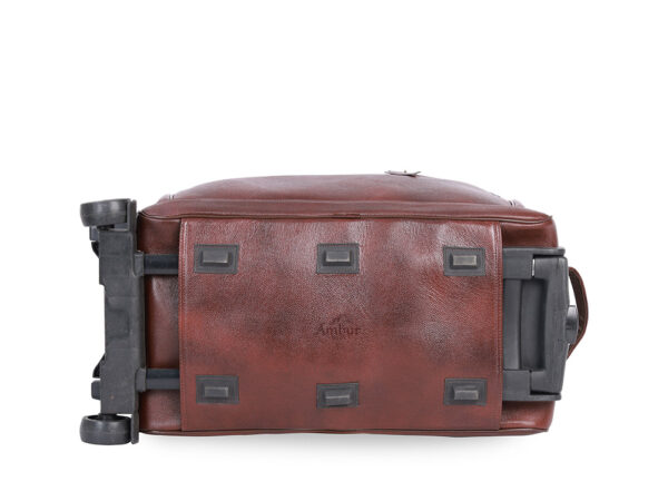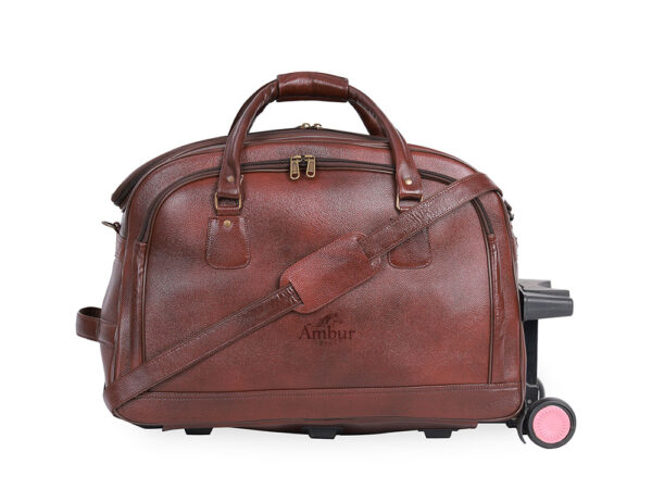Premium genuine cow leather big size trolley bag with smooth wheels and spacious compartments.
